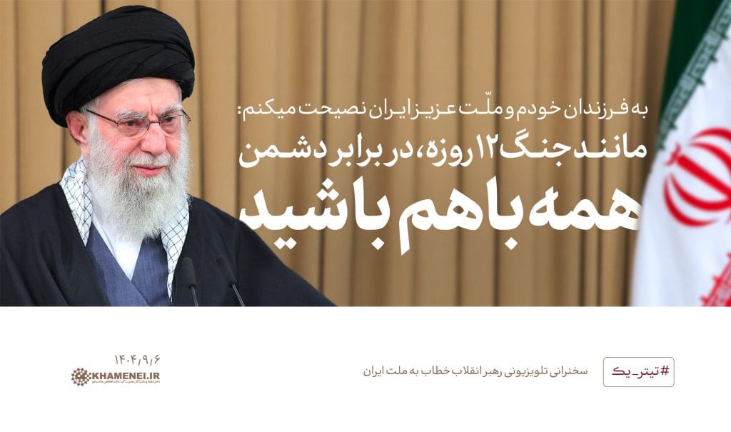 حضرت آیت‌الله خامنه‌ای رهبر معظم انقلاب اسلامی امشب در سخنانی تلویزیونی خطاب به ملت عزیز ایران، با تاکید بر ضرورت تقویت و استمرار قدرتمندانه بسیج در نسل‌های پی در پی به‌عنوان «یک ثروت بزرگ، حرکت همگانی و عامل افزایش قدرت ملی»، ناکامی آمریکا و رژیم صهیونیستی را در تحقق هیچ یک از اهداف حمله به ایران، نشانه شکست بدون تردید آنها خواندند و با بیان چند توصیه به ملت، همه مردم و جناح‌های سیاسی را به حفظ و تقویت اتحاد ملی فراخواندند.